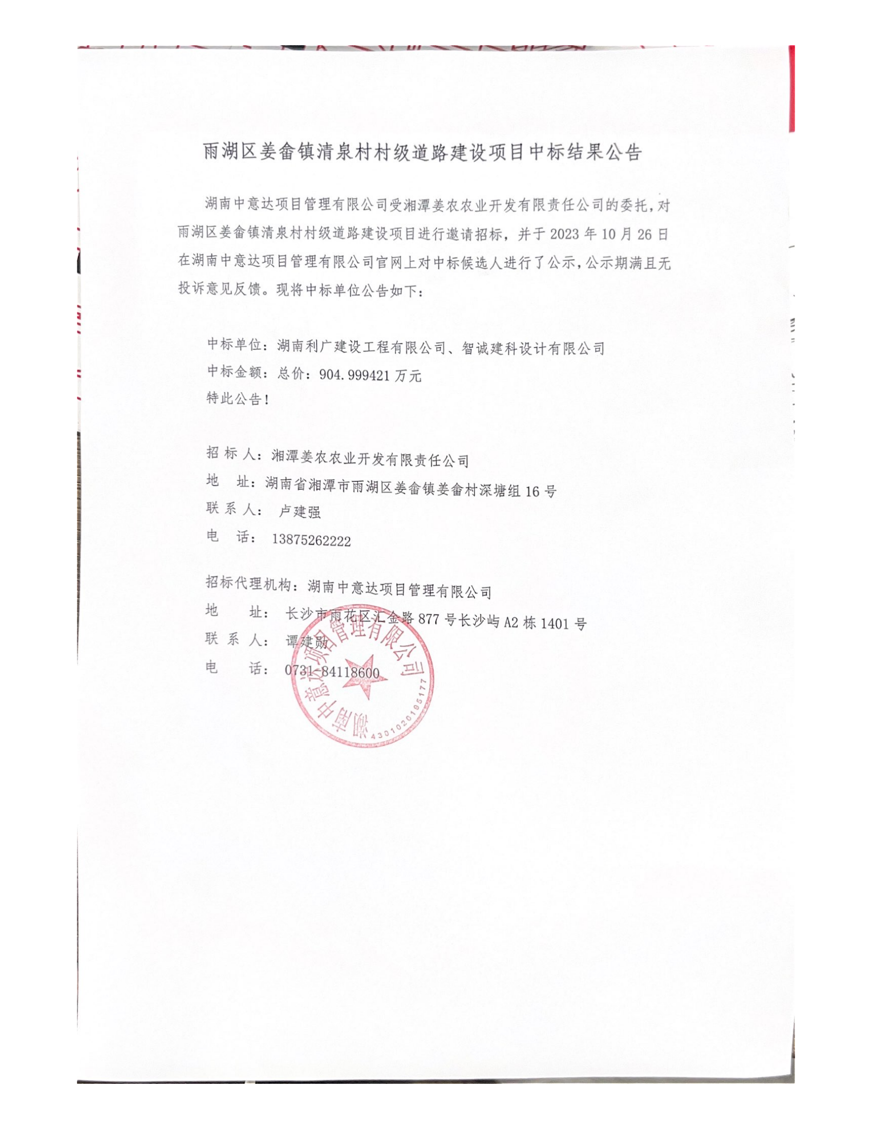湖南中意达项目管理有限公司受湘潭姜农农业开发有限责任公司的委托,对雨湖区姜畲镇清泉村村级道路建设项目进行邀请招标,并于2023年10月26日在湖南中意达项目管理有限公司官网上对中标候选人进行了公示,公示期满且无投诉意见反馈。现将中标单位公告如下: