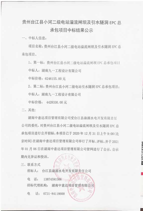 贵州台江县小河二级电站溢流闸坝及引水隧洞EPC总承包项目中标结果公示